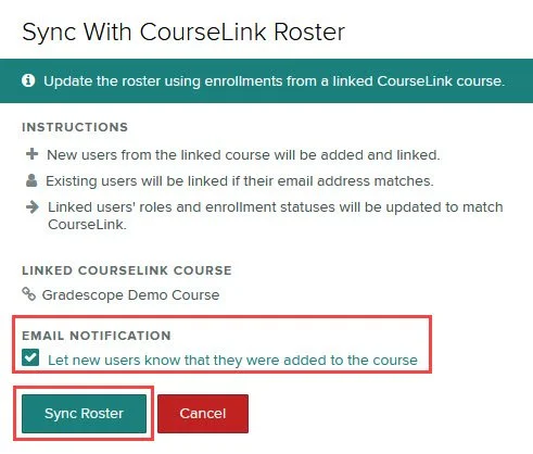 - You will be prompted to select if you would like users to receive an email notification informing them that they have been added to the Gradescope course (enabled by default). If you would not like to inform them (typically deselected for bubble sheet assignments or final exams that will not be reviewed), uncheck the box. Then click the Sync Roster button.
