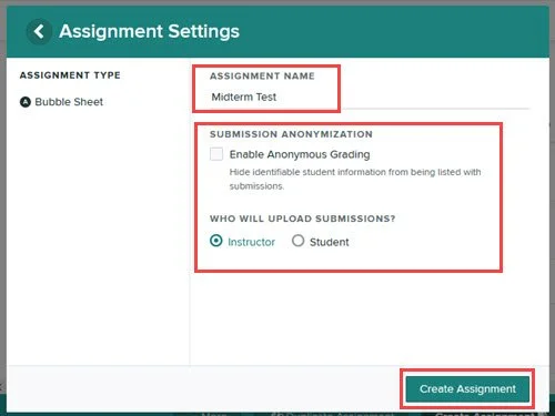Available setting options vary by assignment type. For bubble sheet assignments, Submission Anonymization is typically not enabled and ‘instructor’ is selected for the Who Will Upload Submissions option. More information on settings options for other assignment types can be found below: