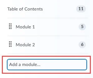 - From the Table of Contents, use the Add a module... option or select an existing module and set it to hidden.