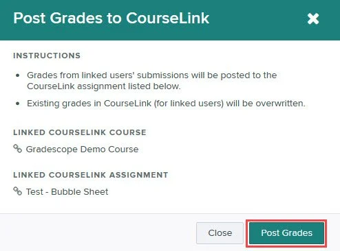 Note: This will not publish the grades or make feedback available through Gradescope, it will only push the scores to the corresponding associated grade item in CourseLink. If that grade item is hidden, students will not see their grades or receive a notification until you make the CourseLink grade item visible.