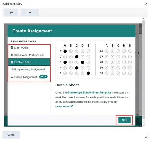 - Select one of the available Gradescope assignment types from the Assignment Types menu and press the Next button.