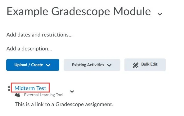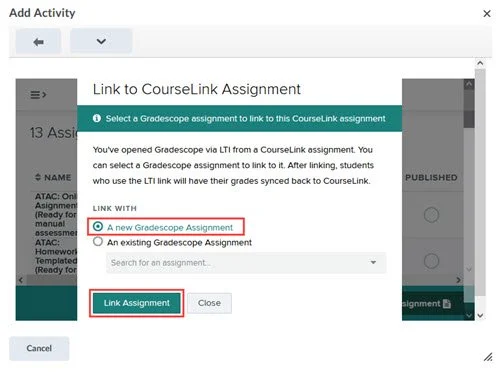 - The Gradescope assignment has now been created in a corresponding Gradescope course linked to your CourseLink site and can be accessed from the link created in the Content tool.
