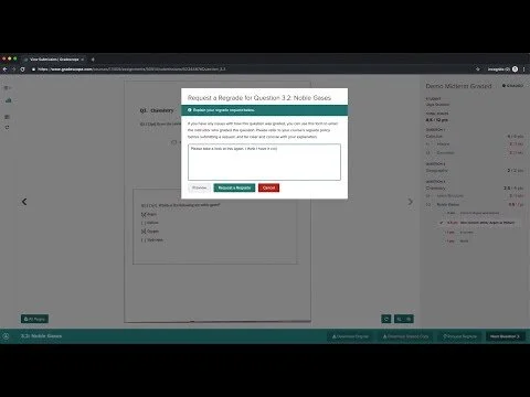 Once grades are published, if regrade requests are enabled, students can select a question and use the Request Regrade button to send a note to the instructor requesting a review of the grade or for clarification about how a particular question was assessed.