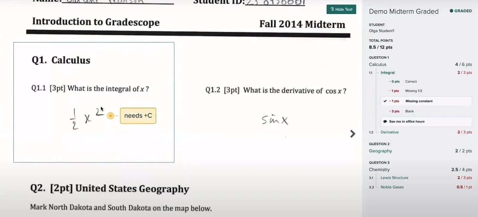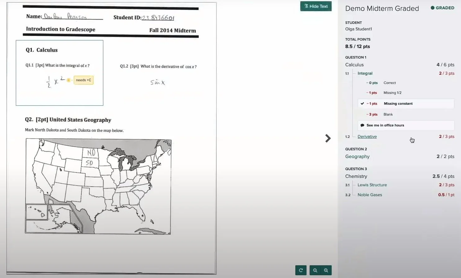 On the right, the total assignment score and the scores for each question will be displayed. Clicking on a question will reveal the rubric used to grade the question, and any items applied to the answer will be highlighted. Sometimes the instructor will add a personalized note which will be displayed below the rubric. Instructors can also type or draw annotations directly on assignments, which are displayed directly inline on the submitted assignment.